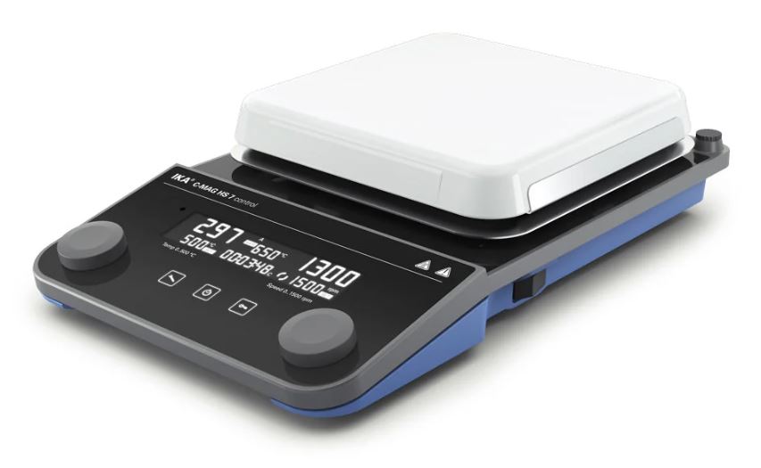 Agitatorul magnetic IKA C-Mag HS 7 control are o plită pătrată din ceramică. Acesta amestecă volume de până la 20 l (H2O) și funcționează la viteze cuprinse între 50 și 1500 rpm.