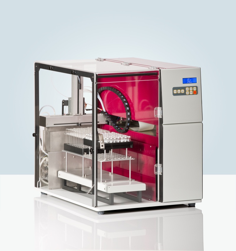 Prelevarea manuală de la un instrument de testare a dizolvării nu este doar consumatoare de timp, ci limitează și reproductibilitatea și este aproape imposibilă dacă produsele cu eliberare susținută trebuie analizate pe perioade lungi de timp. Pharma Test DSR-M oferă o soluție elegantă pentru această procedură de automatizare. Se pot rula până la 20 de cicluri de prelevare (până la 10 dacă este activată diluția). Acestea sunt colectate în două rafturi din interiorul DSR-M. Al doilea raft este utilizat fie pentru colectarea probelor, fie pentru procesarea probelor, cum ar fi diluarea. Designul unic al raftului permite utilizatorului să utilizeze flacoane deschise standard sau flacoane HPLC închise cu sept x-split utilizând același rack. Rafturile DSR-M sunt instalate pe o tavă mobilă pentru a scoate cu ușurință flacoanele umplute și pentru a reumple raftul cu flacoane goale. DSR-M este complet închis de sticlă acrilică transparentă pentru a proteja operatorul de brațul în mișcare și probele de orice sursă externă.