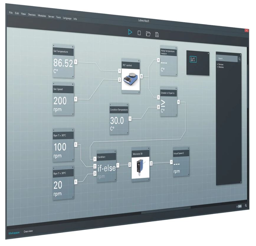 Funcții suplimentare, cum ar fi temporizator, protecție la suprasarcină și măsurarea temperaturii, integrate în agitatorul deasupra capului