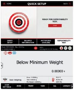 Această aplicație ghidează utilizatorul în efectuarea testului, apoi calculează rezultatul repetabilității și valoarea greutății minime.