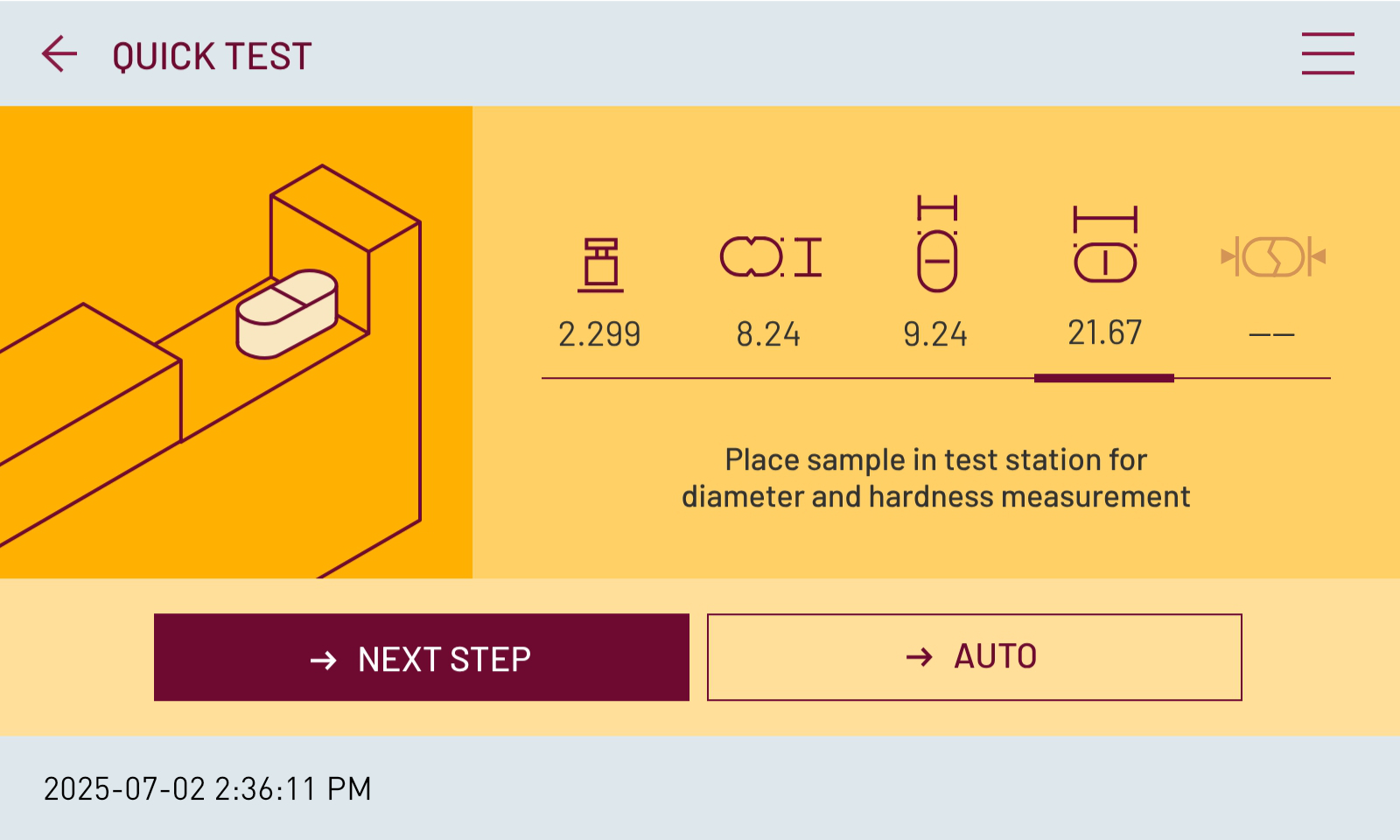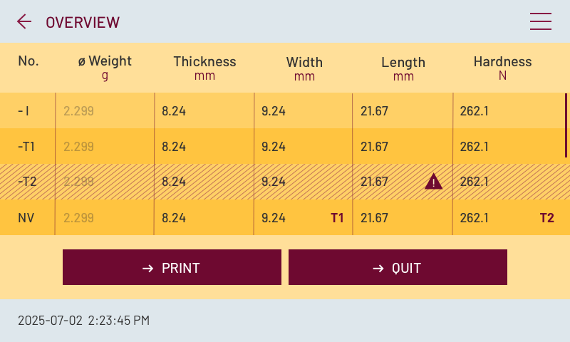 » 5 rezultate pentru aceeași probă: grosime, lățime, diametru (lungime), duritate și greutate (prin intermediul unei balanțe analitice externe conectate)