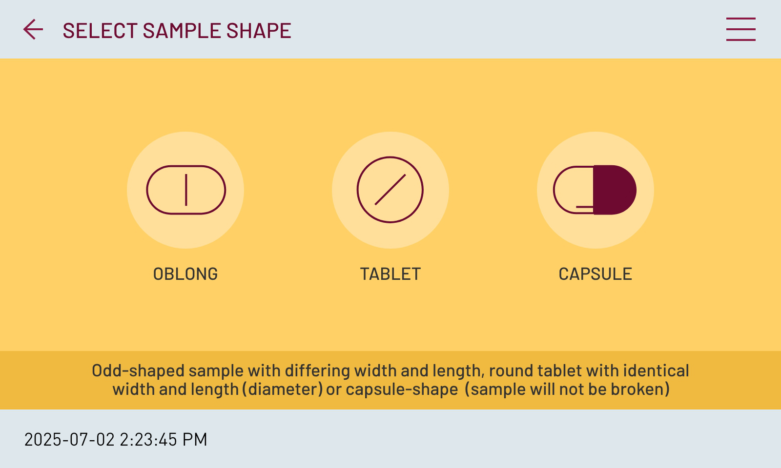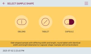 Selectarea formei probei Atunci când executați un test, selectați mai întâi forma aproximativă a probei (rotundă, alungită sau capsulă). Aceasta determină ce parametri pot fi măsurați ulterior. Ulterior, selectați parametrii de măsurat, introduceți un număr de lot și începeți testul.