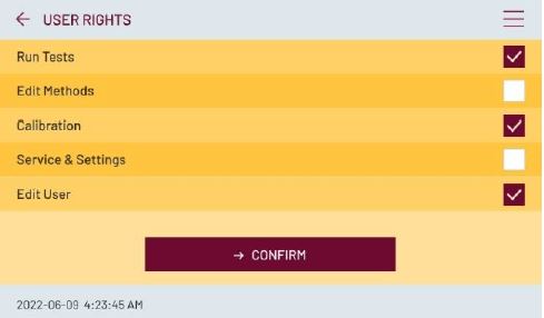 Gestionare de utilizatori PTB 330 dispune de un sistem de gestionare a utilizatorilor. Utilizatorii pot fi definiți cu nume de utilizator și parolă și li se poate atribui o combinație de drepturi: rularea testelor, editarea metodelor, efectuarea calibrărilor, efectuarea service-ului și modificarea setărilor, editarea utilizatorilor.