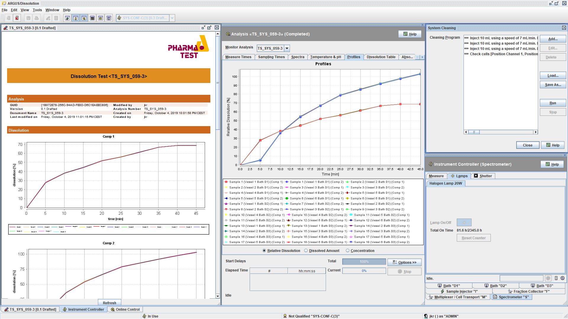 Pompa IPC multicanal este utilizată pentru transferul mediului din vase în spectrometru. Probele de aici sunt circulate într-o buclă închisă, astfel încât să nu existe nicio pierdere de volum a probei pe durata testului de dizolvare. La momentul programat, circulația probei este oprită și se colectează fie o citire a absorbanței într-un singur punct, fie un spectru UV/VIS complet al fiecărui vas. Controlul întregului sistem, precum și manipularea, calcularea și raportarea datelor sunt efectuate de software-ul WinDiss ARGUS, conform standardului 21 CFR Partea 11.